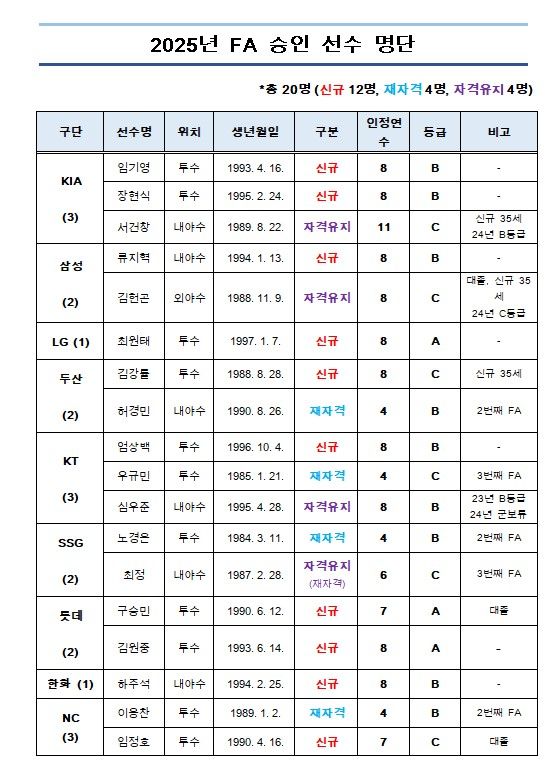 한국야구위원회(KBO)가 5일 2025년 자유계약선수(FA) 자격 선수로 공시된 30명 중 승인 선수 20명의 명단을 공시했다.