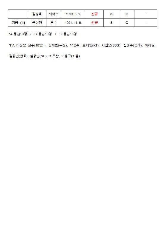 반면 SSG 서진용, 두산 김재호, KT 오재일, 롯데 진해수, 한화 이재원, NC 심창민 그리고 키움 이용규와 최주환은 FA를 신청하지 않았다.