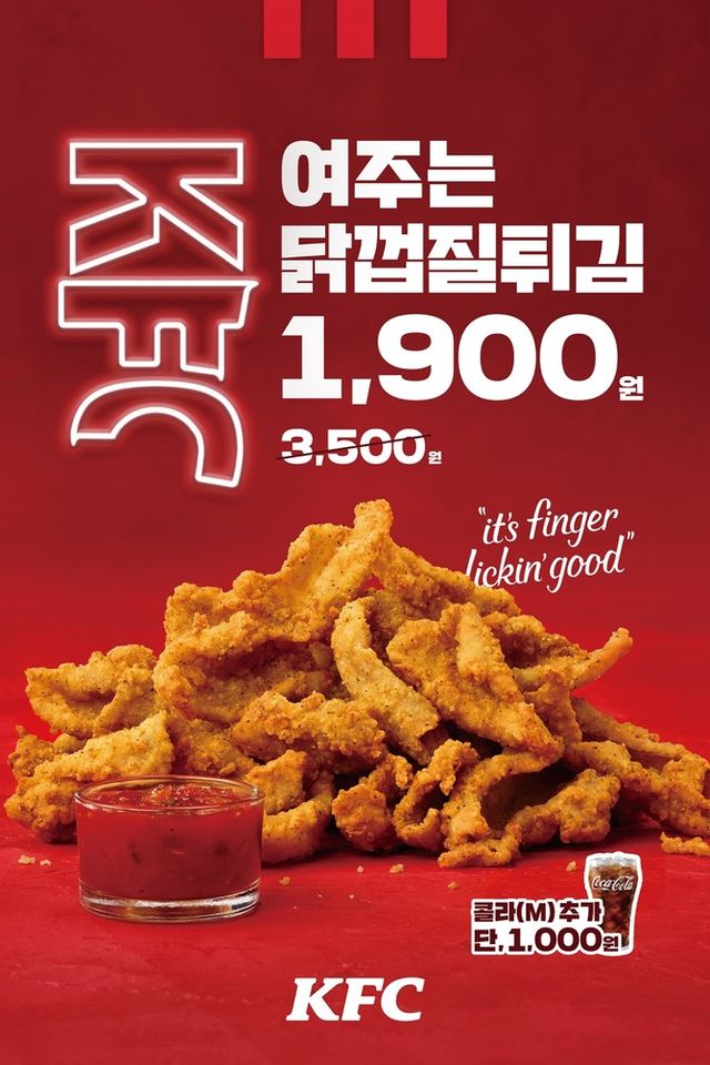 KFC '닭껍질튀김 1900원 프로모션'은 닭껍질튀김을 기존 가격보다 약 45% 할인된 가격으로 구매할 수 있는 행사다. 여기에 1000원을 추가하면 콜라가 함께 제공되어 닭껍질튀김을 더욱 맛있고 풍성하게 즐길 수 있다.