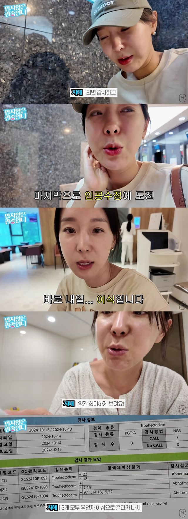 이어 올해를 넘기면 어려울 수 있다며 시험관에 도전했지만 시험관 역시 좋은 소식을 가져다주지 않았다. 이지혜는 "수정된 5개 중에 3개가 배양됐는데 모두 유전자 이상 결과가 나왔다"고 이야기했다.