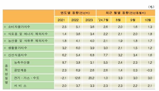 신선식품지수는 1.6% 상승률을 기록했다. 9월(3.4%)에서 1.8%포인트 떨어졌다. 생활물가지수 상승률도 1.2%를 기록해 둔화 흐름을 이어갔다.