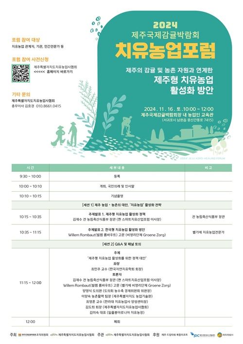 도치유농업사협회가 주관하고, (사)제주국제감귤박람회조직위회와 도치유농업사협회가 공동주최하는 이번 행사는 제주에서 처음으로 열리는 치유농업 포럼으로 제주국제감귤박람회 기간인 오는 16일 서귀포시 남원읍 소재 박람회장 내 농업인교육관에서 열린다.