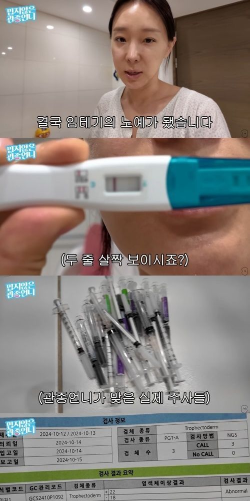 인공 수정 6일 차에 임신 테스트를 한 결과 임신을 뜻하는 두 줄이 떴다. 그는 "경우의 수가 많으니까 설레발치지 않고 참아보려 한다"라며 "임신 테스트기 노예가 됐다. 이제 그만해야겠다. 의사 선생님 말씀대로 참고 기다려야겠다"라고 다짐했다.
