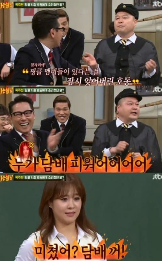 여러 오답이 나온 가운데 이상민은 “담배 꺼”라고 답했고 옥주현은 “정답”이라고 말했다. 이에 강호동은 “나는 뭣도 모르고 올라오다가 커튼으로 분리가 돼 있어서 핑클이라고 생각도 못하고 한 모금 피웠다”고 해명했다.