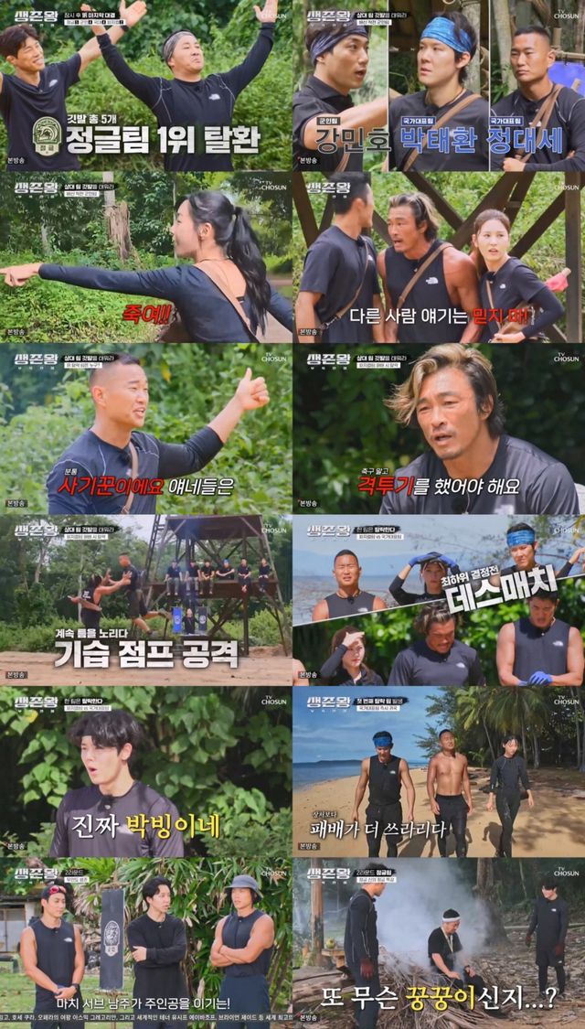 4일(월) 방송된 TV CHOSUN 정글 서바이벌 예능 ‘생존왕 : 부족전쟁’(이하 ‘생존왕’)에서는 사바정글에서 펼쳐지는 1R의 마지막 대결의 날이 밝았다. 미지의 정글로 방출됐던 ‘정글팀’ 김병만X정지현X김동준은 밤새 내린 비 때문에 추위에 잠을 설치며 생고생했지만, 수백 마리 박쥐들이 있던 동굴 속에서 베네핏으로 깃발을 하나 획득해 금의환향했다. 정글팀의 깃발이 5개, 군인팀과 국가대표팀이 4개, 피지컬팀이 2개로 정글팀이 1위를 차지했다. 자동으로 2R에 진출한 정글팀은 다음 생존지로 먼저 떠났다.