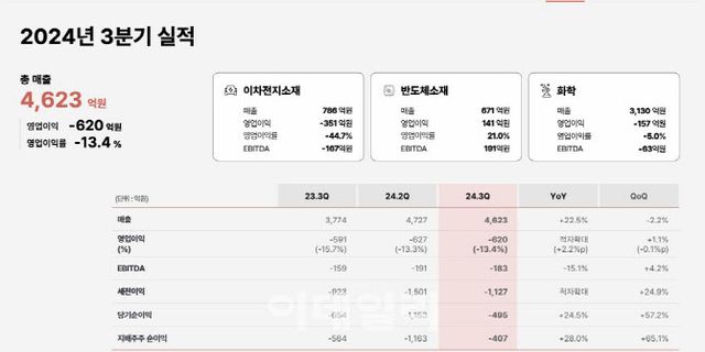 회사 측은 “주요 사업의 업황 회복이 여전히 쉽지 않아 매출 규모의 양대 축인 이차전지소재와 화학 사업의 영업손실로 이어졌다”면서 “사업별 경쟁력 강화를 통해 내년 이후 실적 반등을 준비하고 있다”고 말했다.