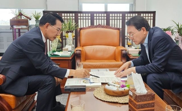 | ▲ 4일 이완섭 서산시장과 성일종 국방위원장이 주요 현안 사업에 대해 의견을 나누는 모습 |