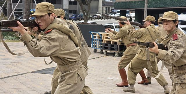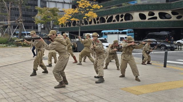 | ▲ 2024년 11월 4일 서울 시청 앞에서 11월 14일 개봉 영화 ‘춘천대첩 72시간’ 홍보 이벤트의 일환으로 배우들이 인민군 복장과 총기를 소지하고 전투 대형으로 이동하는 퍼포먼스를 진행했다. (나인픽처스 사진제공) |