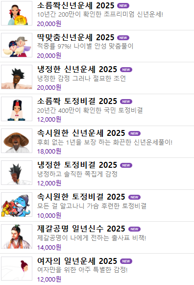 이외에도 만사형통 소름쫙 신년운세 2025, 딱 맞춤 신년운세 2025, 소름쫙 토정비결 2025, 제강공명 일년신수, 여자의 일년운세, 토정비결 등 다양한 운세를 재밌게 점칠 수 있다.