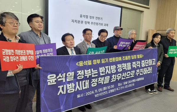 균형발전 시민단체들이 지방시대를 위한 정책적 대전환을 촉구했다. 윤석열정부 임기가 반환점에 도달했지만 여전히 ‘지방시대 선언’은 더딘 움직임만 보이고 있고 대신 국가불균형발전을 초래하는 수도권 규제완화엔 전광석화와 같은 속도감을 보이면서 되레 국가균형발전이 후퇴했다는 평가가 나온다. 정부가 윤석열정권 집권 초기, 수도권 개발을 통한 경기부양을 위해 수도권 규제의 빗장을 풀고 반도체 등 핵심산업을 살려야 한다며 대규모 수도권 투자유발정책을 제시하는 사이 비수도권·지방의 소멸 위기는 더욱 가중됐다는 얘기다. 지방을 살리겠다는 선언적 의지 표명에만 그칠 게 아니라 실행력이 담보된 실질적인 분권·균형발전정책을 과감하게 추진해야 한다고 이들은 강조한다.