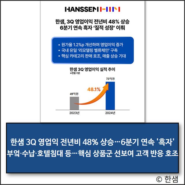 한샘은 경기 침체와 소비심리 회복 지연으로 매출이 소폭 감소했지만 공급망 최적화로 원가율을 개선했다. 이에 전년 동기 대비 1.2%p 향상 및 영업이익 증가라는 질적 성장을 달성했다고 설명했다.