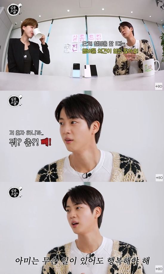"뭐가 제일 좋냐"라는 장도연의 물음에 진은 "단체 앨범을 할 때는 멤버들 의견이 엄청 많다. 음악이랑 춤은 뭐 어떻게 해야한다 이런 게 많았는데 저 혼자 하니까 춤? 빼! 이런 일정? 빼! 할 수 있게 됐다"라며 솔로 활동의 장점을 언급했다.