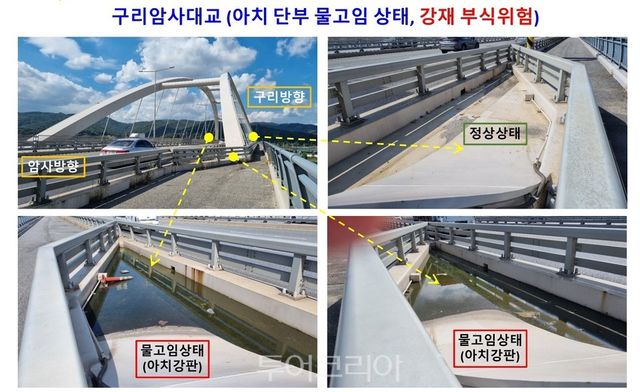 [투어코리아=유경훈 기자] 구리암사대교의 상부 아치 단부 2개소가 비가 오면 잠겨 부식 위험성이 높은 것으로 나타났다.