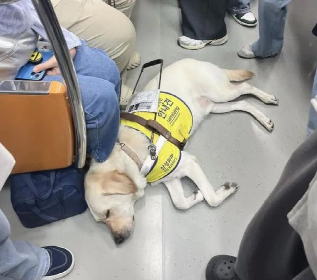사진 속 래브라도 리트리버는 ‘안내견’ 표식이 있는 옷을 입고 지하철 바닥에 누워 잠을 자는 모습이다.