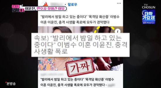 이에 이윤진은 "이혼 소송 중인데 이런 루머는 타격이 있는 거 아니냐. 현재 양육권 분쟁 중이기도 하다"라며 본인의 상황을 전하자 변호사는 "이런 상황에 있어서는 열애설에 대해 명예 훼손으로 고소가 가능하다"라고 답했다.