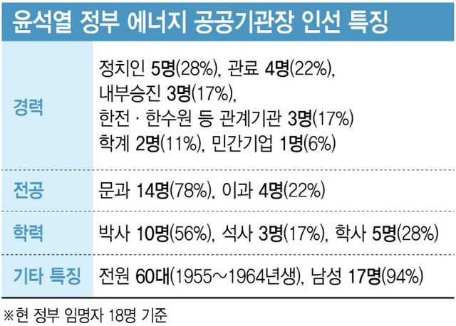 기존에 가장 많은 비중을 차지했던 산업부 관료나 한전 출신 기관장은 상대적으로 줄었다. 18명 중 4명(22%)이 관료 출신이었으나, 이중 산업부 출신은 김준동 남부발전 사장 등 2명뿐이었다. 한전 출신도 이정복 서부발전 부사장 1명뿐이다.