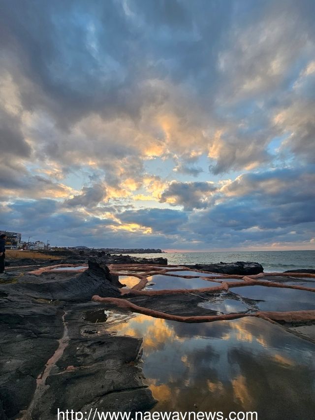 ▲ 제주,애월읍 구엄리 돌 염전에 노을이 붉게 물들어 작은 돌 염전에 하늘빛 노을이 담겨지고 있다. 김봉화