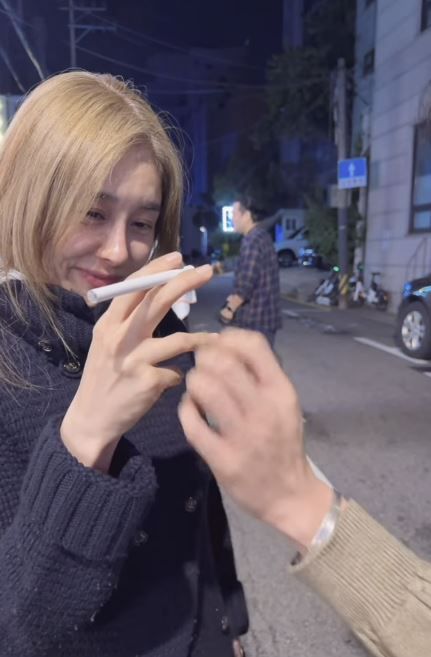 영상 속 옥주현은 동료 배우의 도움으로 길거리에서 비타민 스틱을 이용해 자연스러운 흡연 신을 위해 연습헤 열중하고 있다.