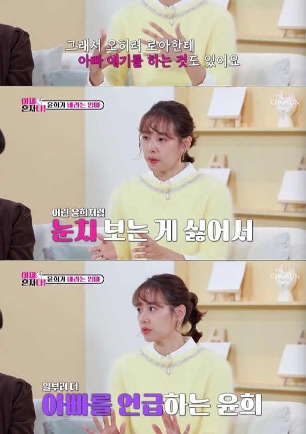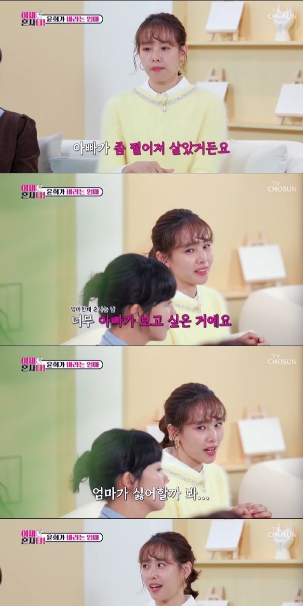 조윤희는 "아빠와 떨어져 살았다. 아빠가 일주일에 한번, 한달에 한번 오셨다. 가끔 엄마에게 혼난 날 아빠가 너무 보고 싶은데 보고 싶다는 이야기를 한 번도 못했다. 하면 엄마가 싫어할까 봐"라며 어린 시절 이야기를 꺼냈다.