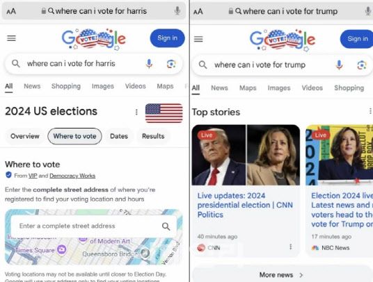 구글 검색창에 해리스에 대한 검색 결과는 검색자가 투표소를 찾을 수 있는 창을 표시했지만, 트럼프에 대한 검색 결과는 뉴스 기사만 표시되고 따로 지도는 표시되지 않았다.