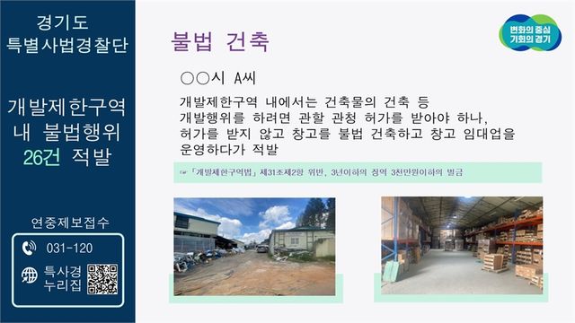 경기도 특별사법경찰단은 도민들의 제보를 적극 독려하고 있으며, 경기도 누리집(gg.go.kr/gg_special_cop)과 경기도 콜센터(031-120)를 통해 불법 행위에 대한 신고를 받고 있다.