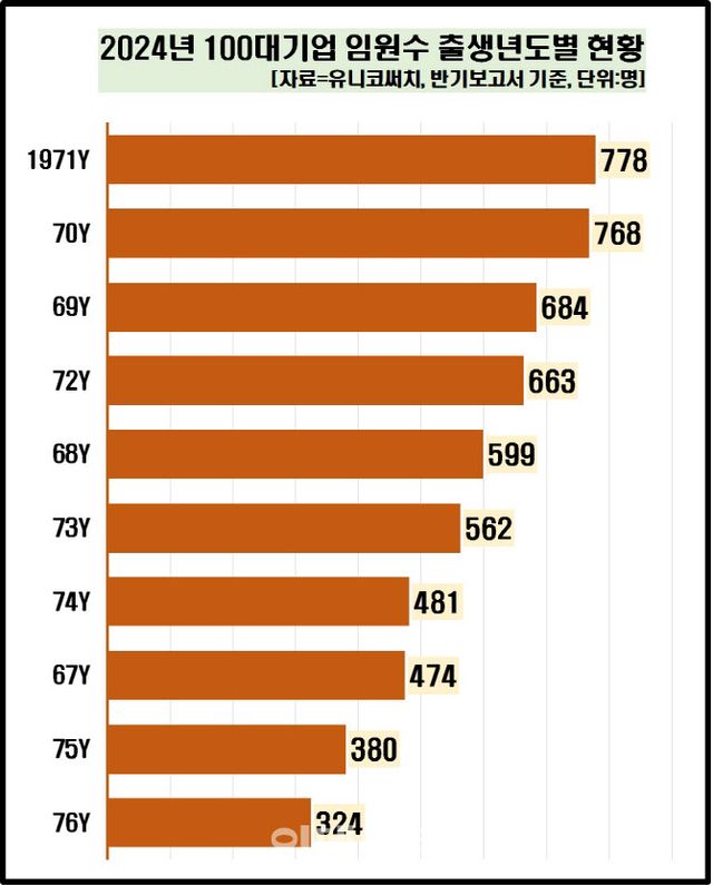 작년 대비 올해 기준으로 임원 배지를 가장 많이 단 출생자는 1974년생인 것으로 확인됐다. 1년 새 94명 증가했다. 이어 △1973년(82명↑) △1975년(77명↑) △1972년(60명↑) 출생자도 60명 넘게 임원으로 승진했다. 특히 1973년~1975년생 임원 숫자만 253명이나 많아졌다. 반면 1968년생은 68명이나 임원 수가 줄었고, 1967년생(61명↓)과 1969년생(50명↓)도 50명 넘게 짐을 싸고 회사를 떠나 희비가 교차했다.