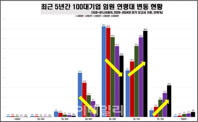 이와 달리 1965년~1969년에 태어난 1960년대 후반 출생 100대 기업 임원 비율은 2020년(46.2%)에 최고 정점을 찍고 2021년(45.5%)→2022년(40.7%)→2023년(36.1%)까지 내려앉더니, 올해는 31.3%로 하락했다. 2025년 임원 인사에서 1960년생은 20%대로 낮아질 가능성이 한층 높아졌다.