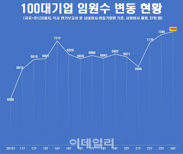 올해 파악된 국내 100대 기업 임원 수는 7404명으로 집계됐다. 이는 작년 파악된 7345명보다 59명 많아진 숫자다. 작년 대비 올해 100대 기업 임원 책상은 0.8% 늘어난 셈인데 저조한 경영 실적과 상반된 횡보다. 전년 대비 지난해 국내 100대 기업 매출 외형은 1417조 원에서 1345조 원으로 1년 새 5.1% 수준으로 매출 덩치가 작아졌고, 영업이익은 48%(58조 원→30조 원)나 크게 고꾸라졌다.