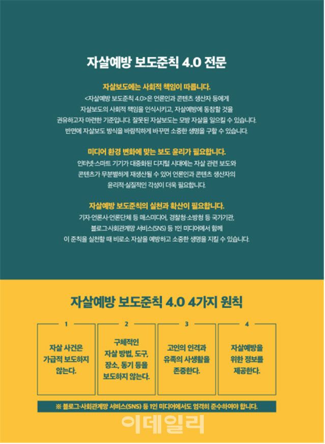 국민의 알권리 보장을 위해 불가피하게 보도를 하는 경우에도 반드시 지켜야 하는 핵심 내용을 담아 △구체적인 자살 방법, 도구, 장소, 동기 등을 보도하지 않는다 △고인의 인격과 유족의 사생활을 존중한다 △자살예방을 위한 정보를 제공한다 등 총 4개의 원칙을 제시했다.