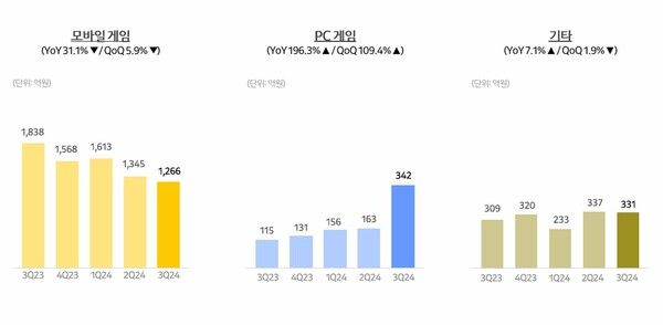 반면 PC온라인 게임은 '배틀그라운드' 효과 등으로 전년 동기 대비 196.3% 증가한 342억원의 매출을 달성해 모바일 부문 실적 부진을 채웠다. PC온라인 게임은 전분기 대비로도 약 109.4%로 증가하는 등 성장세가 가팔랐다.