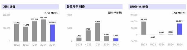 올 3분기 위메이드는 전체 매출 비중의 60%를 차지하는 게임 부문에선 1279억원의 매출을 올렸다. 이어 라이선스 부문과 블록체인 부문에선 각각 835억원과 11억원의 매출을 기록했다.