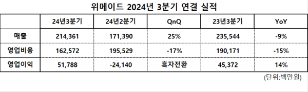 이날 위메이드 관계자는 "3분기 영업비용은 15% 감소했는데 인건비는 전년 동기 대비 10% 감소했다"라며 "인건비 중 주요 인력 대상 주식보상비용이 4분기에 80억원 감소할 예정이고 2025년 1분기부터 100억원이 감소할 예정"이라면서 비용 효율화가 계획대로 진행되고 있다고 설명했다.