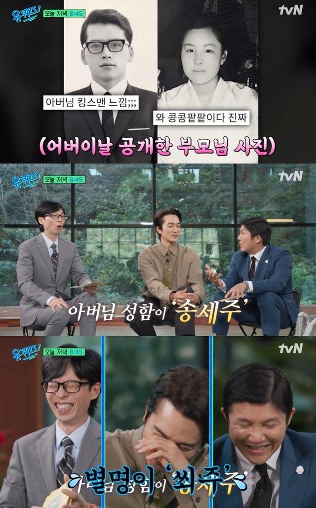 공개된 사진에 감탄한 조세호와 유재석. 조세호는 "그런데 아버님 성함이 굉장히 세련되셨더라. '송세주'시더라"라고 이야기했다.