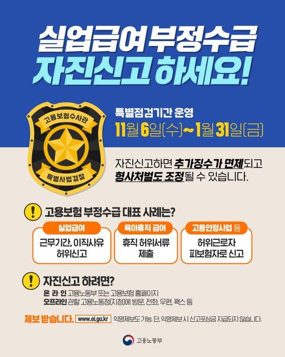 자진신고와 제보는 고용24 홈페이지(work24.go.kr), 국민신문고 등 온라인과 함께 거주지 관할 지방고용노동관서에 유선·방문으로도 할 수 있다.