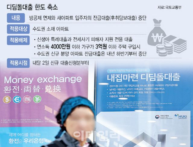 경기도에서 5억원짜리 아파트를 살 경우 지금은 디딤돌대출 가능액이 주택담보대출비율(LTV) 70%를 적용한 3억5000만원인데, 다음 달 2일 신규 대출분부터는 최우선변제금 4800만원을 뺀 3억200만원으로 축소된다는 얘기다.