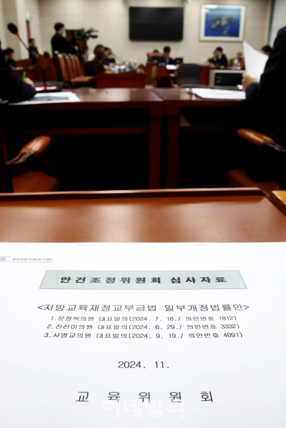 이날 교육위원회는 오전에 안건조정위원회를 열고 문정복 더불어민주당 의원 등이 발의한 6건의 지방교육재정교부금법 일부개정법률안을 일괄 상정해 처리했다. 또 오후에는 전체회의를 열어 안건조정위원장을 맡았던 문정복 의원이 나와 심사 보고를 했다.