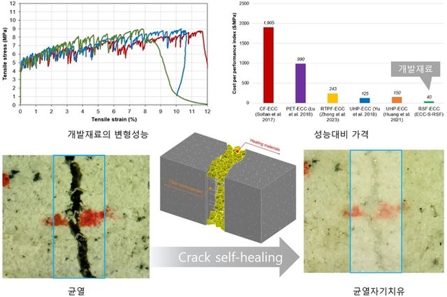 전남대 이방연(건축학부. 교신저자). 김영상(토목공학과) 교수연구팀이 개발한 콘크리트는 일반 콘크리트보다 2.5배 이상의 압축강도(84MPa)와 1000배 이상의 변형 성능(10% 이상)을 보여주는 것은 물론, 스스로 균열을 치유하는 자기 치유 능력까지 갖추고 있다.