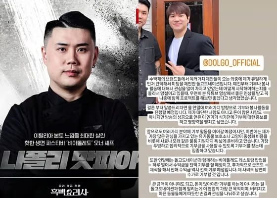 이어 "또한 연말에는 돌고도네이션과 함께하는 레스토랑 팝업을 하루 열어서 수익금 전액을 기부할 예정이고 추가적으로 굿즈도 제작해서 판매 수익금 역시 전액 기부 예정이다. 제 사비도 당연히 추가적으로 기부할 것"이라고 따뜻한 약속을 전했다.