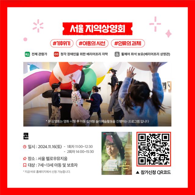 특히 서울지역상영회는 헬로우뮤지움(서울시 성동구)에서 11월 16일(토) 11시와 14시 2회에 걸쳐 진행되며, 어린이 및 가족 100여명을 초대해 어린이와 보호자를 위한 아동권리영화제 수상작 관람 후 그림책을 활용한 놀이활동&퀴즈 등 영화 속 기후 위기 이야기를 나누고, 건강한 지구를 지키는 방법을 배우기 위해 리사이클 예술활동 체험형 놀이프로그램이 진행될 예정이다.