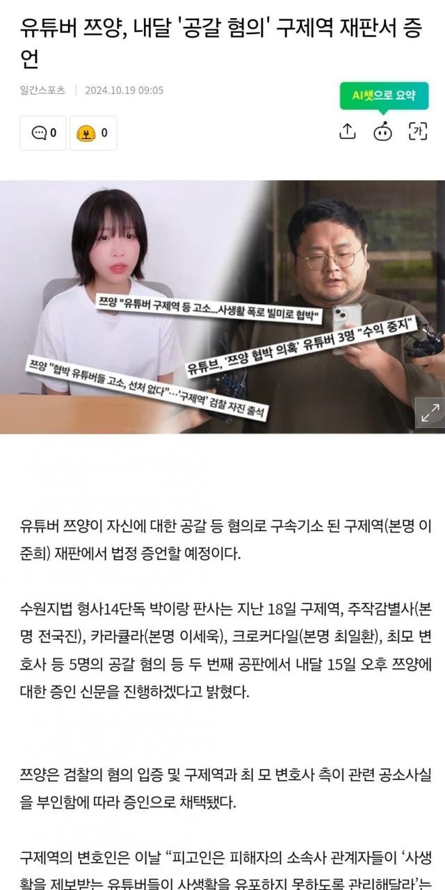 -유튜버 쯔양, 내달 ‘공갈 혐의’ 구제역 재판서 증언
