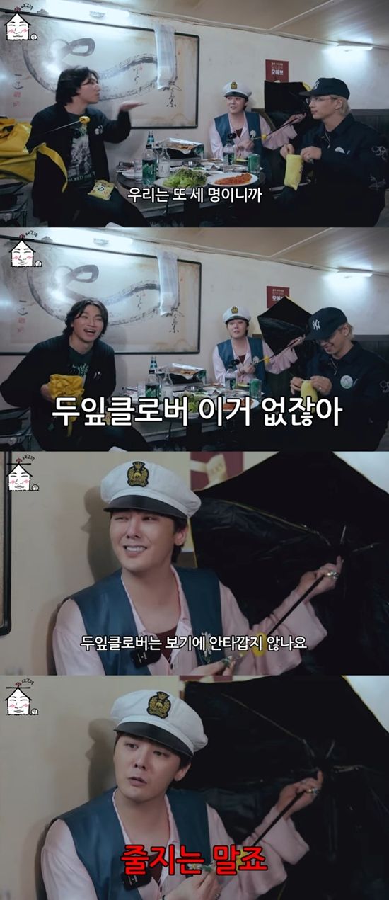 대성은 양산에 붙어 있는 세잎클로버를 발견, "세잎클로버에는 행복이라는 꽃말이 있다. 우리가 또 3명이지 않나"라며 3인조가 된 빅뱅을 강조했다.