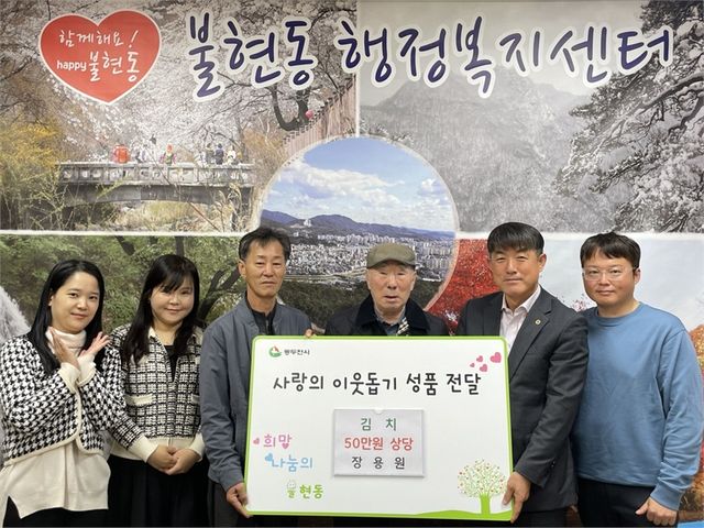 (동두천=뉴스영 변영숙 기자) 동두천시 불현동에 거주하는 장용원 어르신이 불현동 김장철 이웃 돕기를 위해 불현동 행정복지센터에 50만원 상당의 김치를 기부했다.