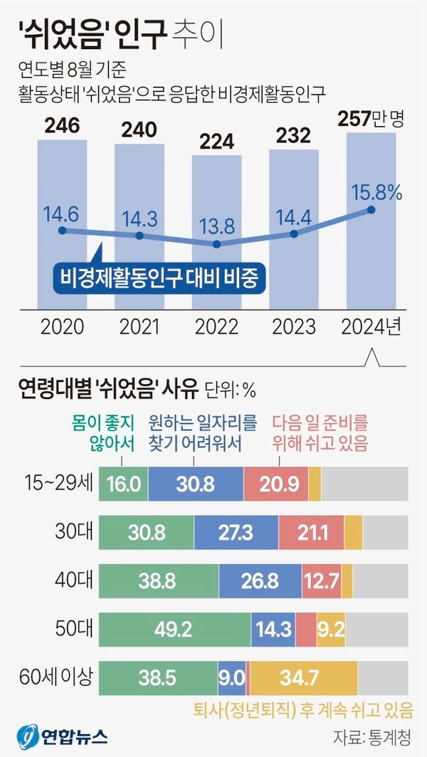 특히 20대 ‘쉬었음’ 인구는 5만 4000명 증가했다. 청년층의 ‘쉬었음’ 이유는 ‘원하는 일자리를 찾기 어려워서’라는 응답이 30.8%로 가장 많다. ‘일자리가 없어서’라는 응답도 9.9%로 조사됐다.
