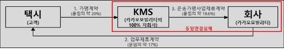 카카오모빌리티는 2020년부터 자회사 케이엠솔루션(KMS)을 통해 가맹택시 브랜드인 ‘카카오T 블루’ 택시에 콜 배차 서비스 등을 제공하고 운임의 약 20%를 수수료로 수취하는 가맹계약을 체결했다. 동시에 택시로부터 운행데이터를 수집하고 마케팅 활동에 참여하는 대가로 운임의 약 17%를 수수료로 지급하는 제휴계약도 체결했다. 그 뒤 카카오모빌리티는 운임의 20%를 수취하는 수수료를 매출액으로 잡고, 운임의 17%를 지급하는 수수료에 대해선 영업비용으로 회계처리하는 ‘총액법’을 사용했다.