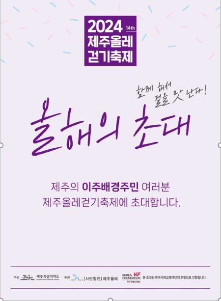 [한라일보] 사단법인 제주올레는 14회째를 맞는 '2024제주올레걷기축제'에서 한국국제교류재단(KF)의 후원으로 이주배경주민과 함께 걷는 '올해의 초대' 프로그램을 처음 진행한다고 6일 밝혔다.