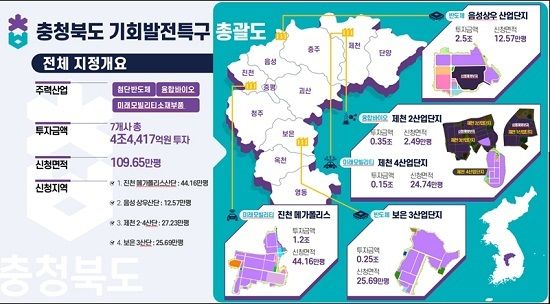 이로써 1차로 발굴된 4개 시군(제천시, 보은군, 진천군, 음성군)에 첨단반도체, 융합바이오, 미래모빌리티소재부품인 道 주력산업을 대상으로 인근 시군과의 상생발전 계획을 수립하고 전체 200만 평 중 약 109.65만 평을 확정하였다.