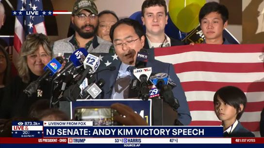 김 의원은 “이런 말을 할 수 있을 거라고는 생각조차 못했던 ‘저지 키즈’로서 진심을 담아 말씀드린다. 내가 여러분의 다음 미국 연방 상원의원이다”라며 승리를 만끽했다. 그는 “부모님과 아내인 카미 (라이)의 끊임없는 지원에 감사를 드린다. 나와 같은 한 소년에게 꿈을 꿀 기회를 준 뉴저지주에도 감사드린다”며 밝힌 뒤, 단상에 오른 두 아들을 향해 자신을 자랑스러워 하길 바란다며 웃었다.