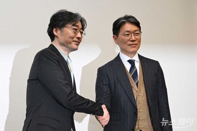 (왼쪽)임종윤 전 한미사이언스 사장과 임종훈 전 한미약품 사장이 3월28일 오후 경기 화성시 수원과학대학교SINTEX에서 열린 '한미사이언스 제51기 정기 주주총회'를 마친 후 임시로 마련된 기자실을 찾아 소감을 전한 뒤 악수를 하고 있다. 사진=강민석 기자 kms@newsway.co.kr