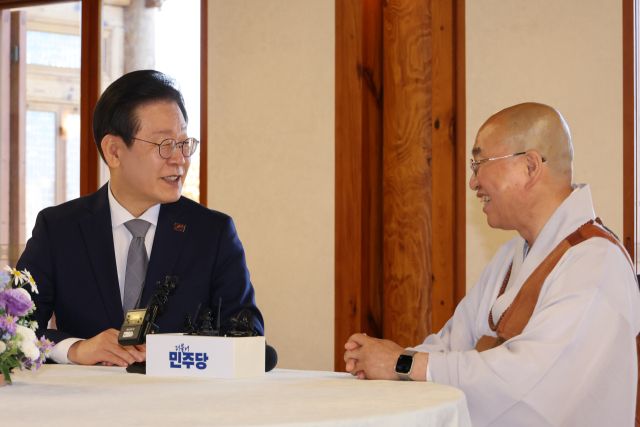 이 대표는 6일 국회 사랑재에서 불교계 인사인 법륜스님과 차담회를 가졌다. 이 대표는 "요즘 세상이 하 수상하고 먹고 사는 문제도 힘들고 특히 평화 문제가 심각해졌다. 말씀 좀 들어보고 싶다"고 말했다.