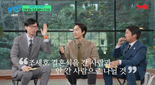 송승헌은 “이동욱 옆에 앉아서 ‘이렇게 성대한 결혼식 처음 봤다’고 했더니 이동욱이 하객이 900~1000명이 왔다더라”며 “결혼식에 간 사람으로서 떳떳하다. 이후에 지인 만나면 ‘조세호 결혼식 안 가셨어요? 난 초대 받아서 갔다 왔다’고 자랑했다”고 털어놨다.